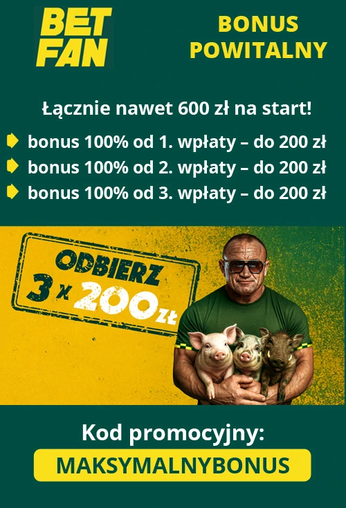W Betfan bonus powitalny to: 100% od 1. wpłaty (maks. 200 zł) + 100% od 2. wpłaty (maks. 200 zł) + 100% od 3. wpłaty (maks. 200 zł). Bonus powitalny aktualny w Betfan dnia: 20 kwietnia 2026 roku. Kod promocyjny: MAKSYMALNYBONUS .