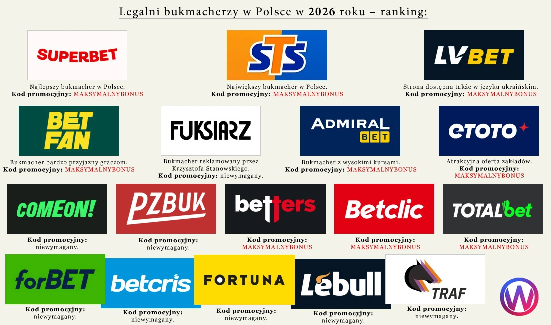 Legalni bukmacherzy w Polsce w 2026 roku: Superbet (najlepszy), STS (największy), LV BET (ukraińska wersja językowa), Betfan (bardzo przyjazny graczom), AdmiralBet (bardzo wysokie kursy), ETOTO, Fuksiarz, Betclic (znany na całym świecie), TOTALbet, ComeOn, PZBuk, Betters, Betcris, Lebull, Fortuna, forBET, Traf (zakłady wyłącznie na wyścigi konne), GOBET (zakończył działalność), WettArena (zakończył działalność).