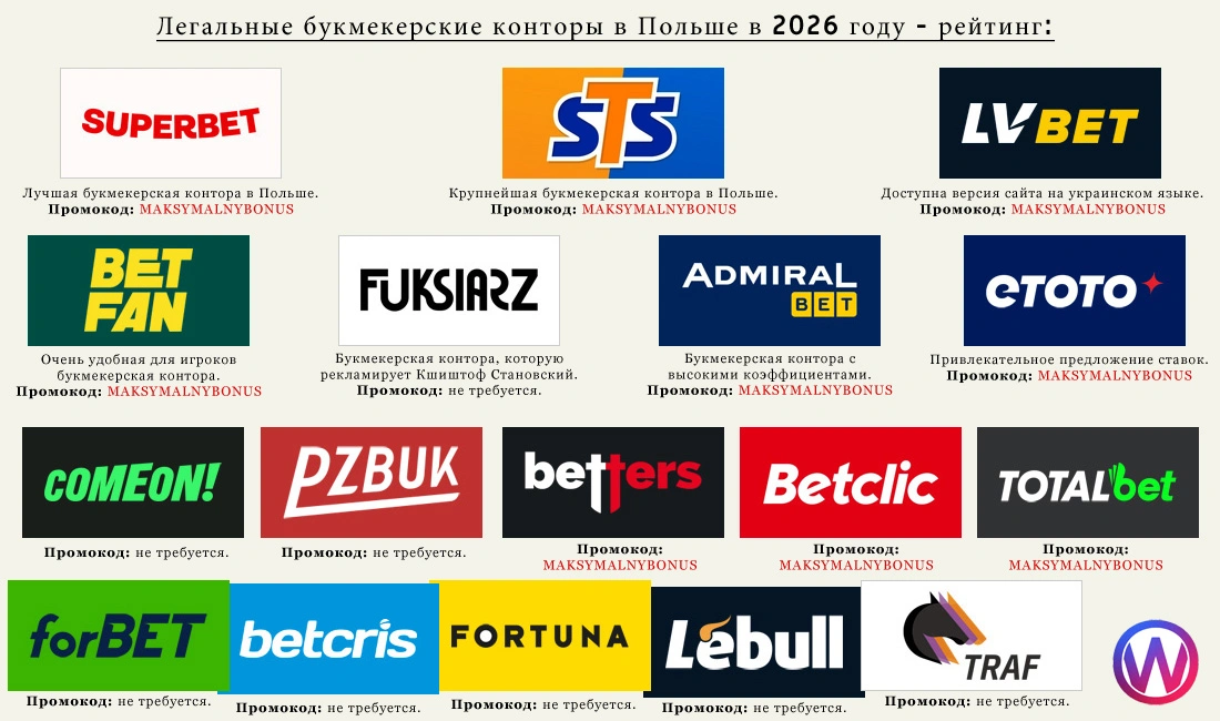 Легальные букмекерские конторы в Польше в 2026 году: Superbet, STS, LV BET, Betfan, AdmiralBet, ETOTO, Fuksiarz, Betclic, TOTALbet, ComeOn, PZBuk, Betters, forBET, Betcris, Fortuna, Lebull, Traf. Игра в букмекерских конторах из этого списка полностью легальна на территории Польши.