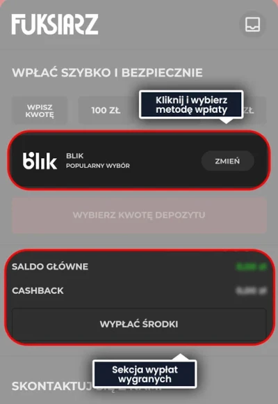Szybki dostęp do wpłat, jak u innych bukmacherów, znajduje się w aplikacji Fuksiarza u samej góry ekranu (ikonka „+”). Po wejściu w panel możesz wybrać jedną z sugerowanych kwot albo wpisać własną kwotę ręcznie. Wybór metod obejmuje płatności poprzez Blik, Przelewy24, karty płatnicze VISA/MasterCard, PayU i Tpay. Brakuje przede wszystkim e-walletów (np. Skrill, Neteller), ale też np. karty PaysafeCard czy płatności przez Revolut. Natomiast od strony technicznej wszystko działa, jak należy. Testowałem wpłaty przez Blik i przez szybki przelew – w obu przypadkach środki pojawiły się na moim koncie w przeciągu około pół minuty od zlecenia transferu.