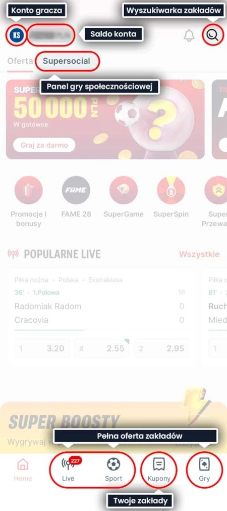Czas na szybkie omówienie, gdzie czego gdzie szukać. W menu dolnym znajdziesz główne kategorie oferty: „Live”, „Sport” i „Gry”, a także zakładkę „Kupony” z wynikami zagranych zakładów. W lewym górnym rogu jest ikona profilu gracza, a obok sekcja wpłat, powiadomień i wyszukiwarka zakładów. W centrum wyświetlają się najciekawsze zakłady i promocje, a jeśli jesteś fanem gry społecznościowej, główny widok możesz 1 kliknięciem przełączyć z „Oferty” na „Supersocial”. Tak zaprojektowany interfejs sprawia, że cały czas wszystko co najważniejsze masz pod ręką.