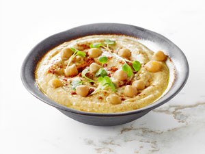 - Klasyczny hummus z ciecierzycy – dodatek do kanapek, wafli ryżowych, tortilli czy też słupków warzywnych: ugotuj 100 gramów (7 łyżek) suchej ciecierzycy, dodaj do niej pół szklanki wody, 6 łyżeczek pasty tahini, 3 łyżki oliwy z oliwek, odrobinę soli i pieprzu. Składniki dokładnie zmiksuj albo zblenduj na jednolitą masę.